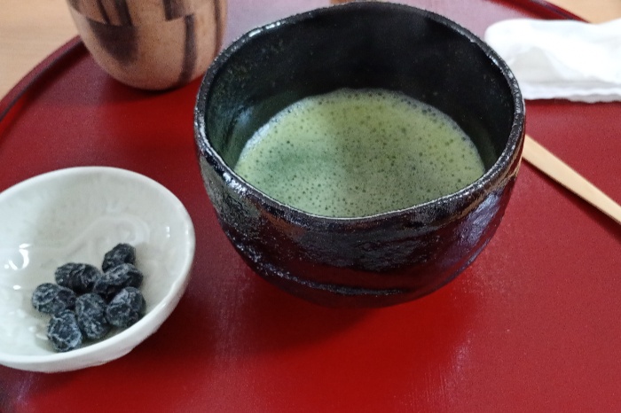 手びねりの黒楽茶碗と丹波黒豆。