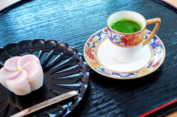 1908年頃ヨーロッパへ輸出された里帰り品です。主菓子は、同じく1908年創業の近所の和菓子屋寿々木さんの御所梅。