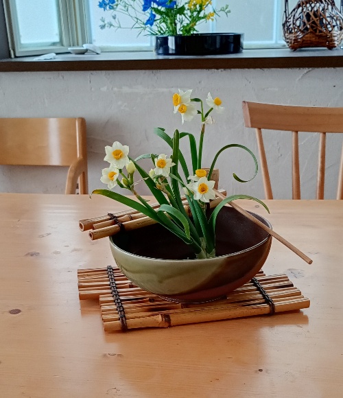 昨日はオンラインで水仙の稽古を行いました。こちらは庭の水仙ですが、水仙が市場に出回る時期は限られており、1年に一度、水仙を生けるのは毎年の楽しみです。水仙では、葉組みや、ためる、葉のクセ付けなど、色々練習できます。草月流では水仙いけばなに細かい決まりはありませんが、必ず、庭に咲いているときよりも美しく生けるように心がけています。