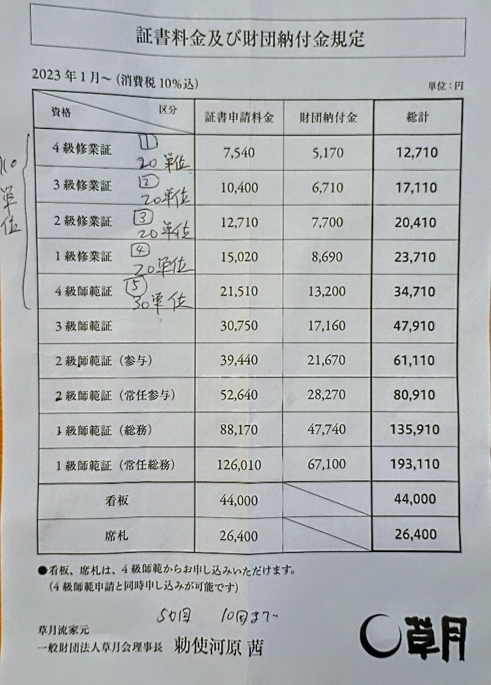 草月流4級師範になるまで110単位あり、師範になって教えるためには、順に草月流本部にお金を払い、修業証を取得しなければなりません。