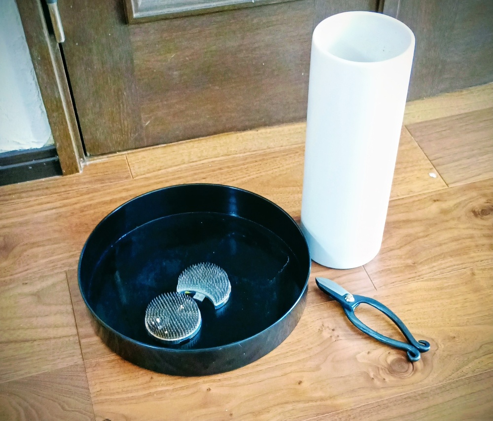 枝切り鋏、水盤(直径30cm程度)、円筒型(高さ30cmくらい)の花瓶、日月剣山さえあればレッスンできます。