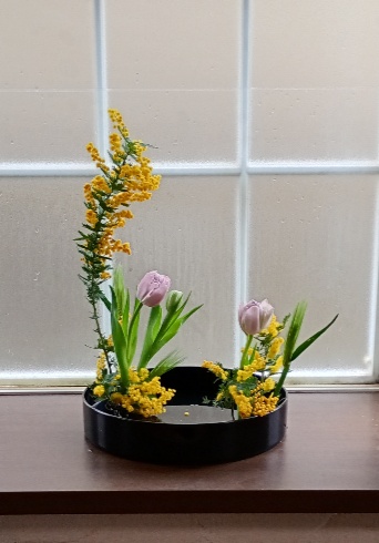 今日は自分の稽古日でした。雪になりそうな雨で、行くのが億劫でしたが、ミモザとチューリップを見て元気になり投入を練習し、家に帰って、こんどは盛花に生け直しました。
